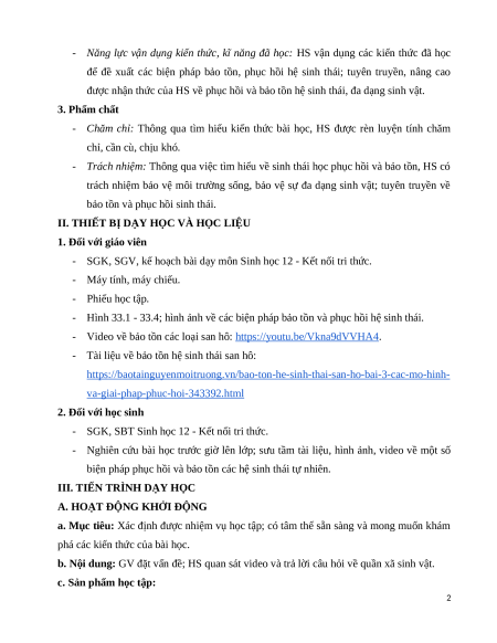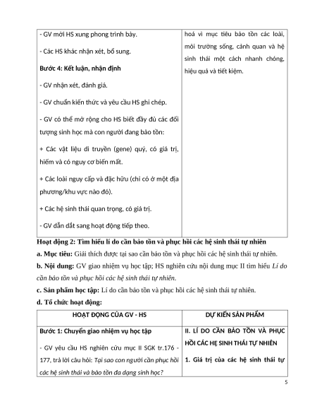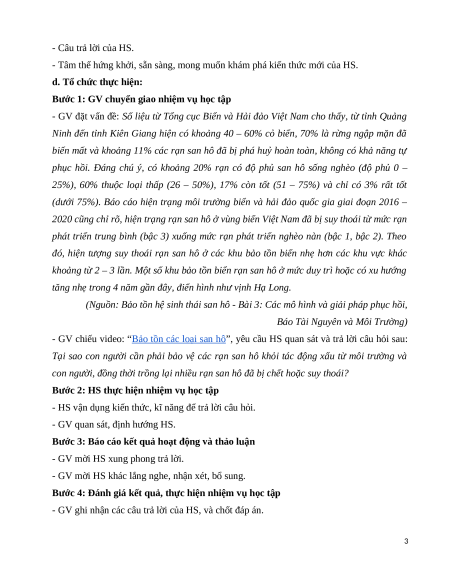 được nhận thức của HS về phục hồi và bảo tồn hệ sinh thái, đa dạng sinh vật. 3. Phẩm chất
