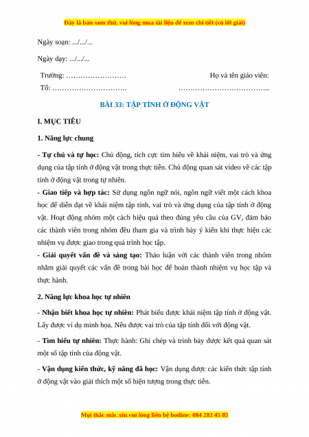 BÀI 33: TẬP TÍNH Ở ĐỘNG VẬT I. MỤC TIÊU 1. Năng lực chung