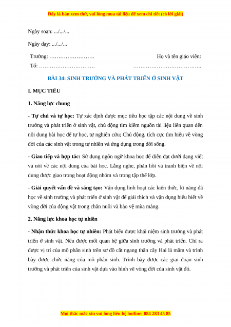 BÀI 34: SINH TRƯỞNG VÀ PHÁT TRIỂN Ở SINH VẬT I. MỤC TIÊU 1. Năng lực chung