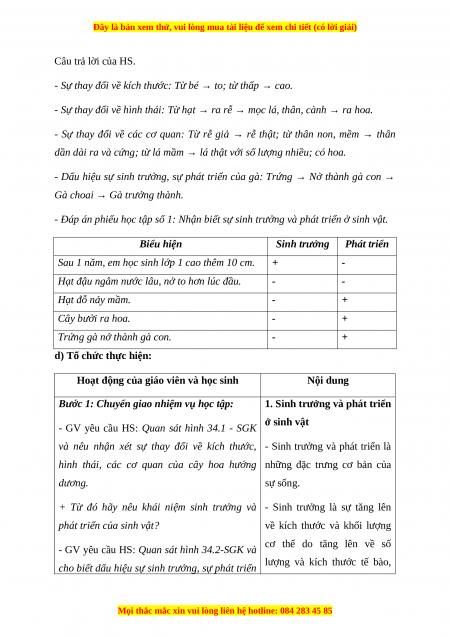 - Đáp án phiếu học tập số 1: Nhận biết sự sinh trưởng và phát triển ở sinh vật.