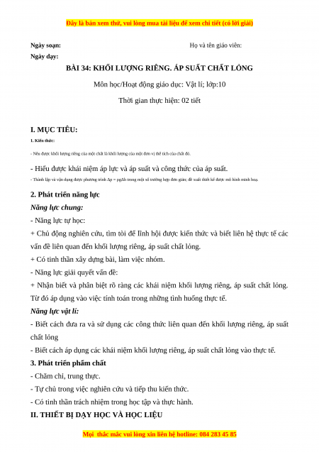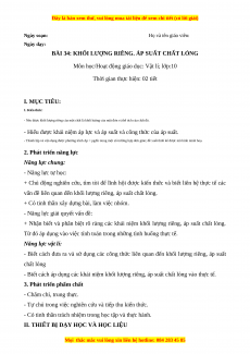 Giáo án Bài 34 Vật lí 10 Kết nối tri thức (2024): Khối lượng riêng. Áp suất chất lỏng