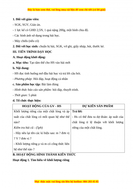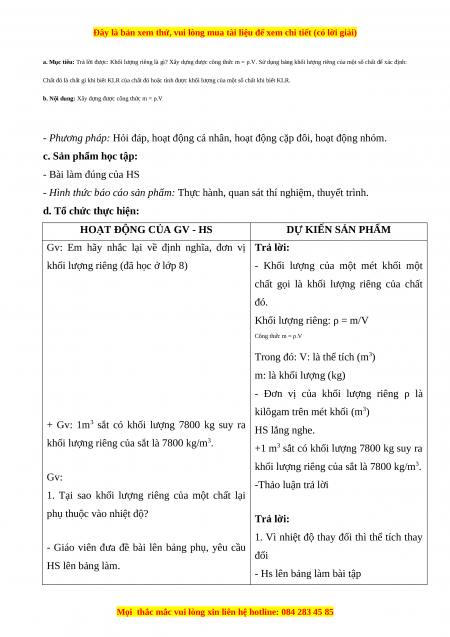 a. Mục tiêu: Trả lời được: Khối lượng riêng là gì? Xây dựng được công thức m = ρ.V. Sử dụng bảng khối lượng riêng của một số chất để xác định: