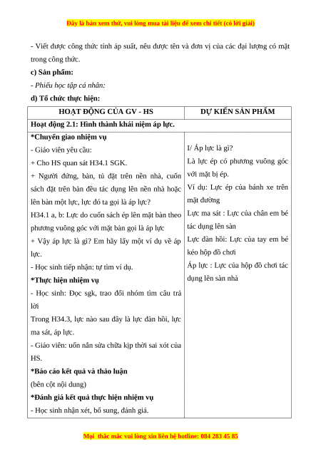 - Phát biểu được định nghĩa áp lực và áp suất.