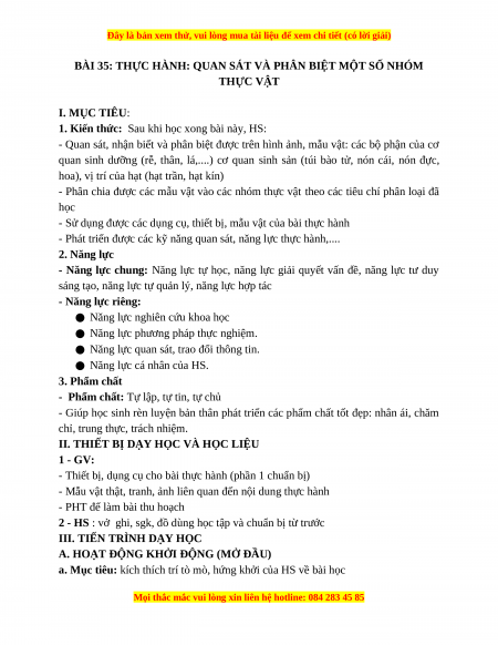 BÀI 35: THỰC HÀNH: QUAN SÁT VÀ PHÂN BIỆT MỘT SỐ NHÓM THỰC VẬT I. MỤC TIÊU: