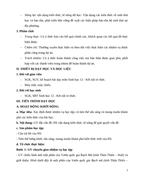 học và bảo tồn, phát triển bền vững đề xuất các biện pháp bảo tồn hệ sinh thái tại địa phương. 3. Phẩm chất