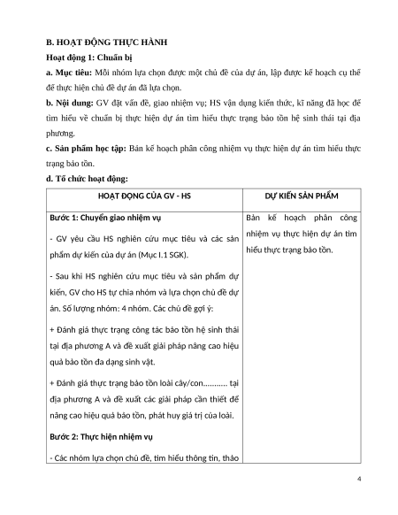 c. Sản phẩm học tập: Bản kế hoạch phân công nhiệm vụ thực hiện dự án tìm hiểu thực trạng bảo tồn.