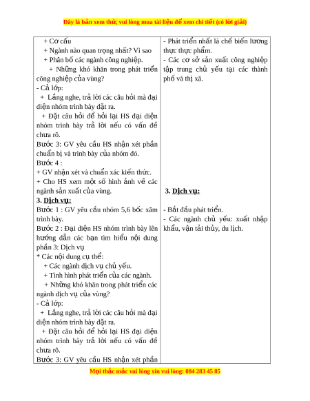ữ khó khăn trong phát tri n ể các ngành dịch vụ c a vùng? ủ - Cả l p: ớ + L ng ắ nghe, tr ả l i ờ các câu h i ỏ mà đ i ạ diện nhóm trình bày đ t ặ ra. + Đ t ặ câu h i ỏ để h i ỏ l i ạ HS đ i ạ di n ệ nhóm trình bày trả l i ờ n u ế có v n ấ đề ch a ư rõ. Bư c ớ 3: GV yêu c u ầ HS nh n ậ xét ph n ầ M i ọ thắc m c