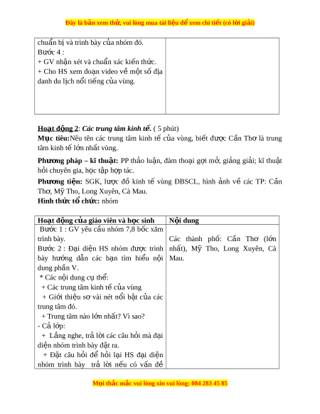 Đây là bản xem th , vu ử i lòng mua tài li u ệ đ xe ể m chi ti t (c ế ó l i ờ gi i ả ) Phư ng ơ ti n ệ : M t ộ số hình nh ả về ho t ạ đ ng ộ kinh t ế và lư c ợ đ ồ kinh t ế vùng Đồng b ng ằ sông C u ử Long. Các bư c ớ ho t ạ đ ng: ộ Bước 1: Giao nhi m ệ vụ - Giáo viên cung c p m ấ t ộ số hình nh ả và yêu c u h ầ c ọ sinh nh n bi ậ t ế :