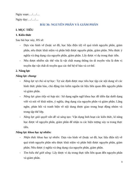 BÀI 36: NGUYÊN PHÂN VÀ GIẢM PHÂN I. MỤC TIÊU 1. Kiến thức Sau bài học này, HS sẽ: