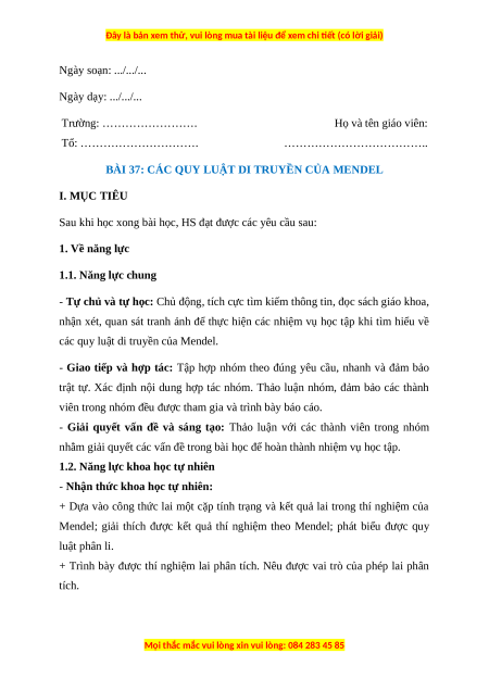 BÀI 37: CÁC QUY LUẬT DI TRUYỀN CỦA MENDEL I. MỤC TIÊU