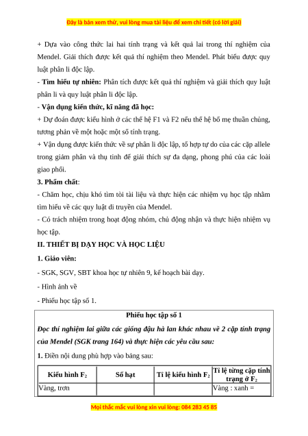 của Mendel (SGK trang 164) và thực hiện các yêu cầu sau: