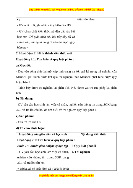 Mendel; giải thích được kết quả thí nghiệm theo Mendel; phát biểu được quy luật phân li.