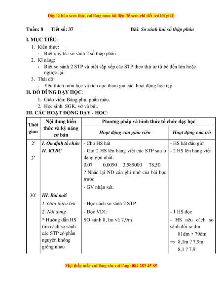 Tuần: 8 Tiết số: 37 Bài: So sánh hai số thập phân