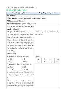 - Củng cố một số kĩ năng liên quan đến tính nhẩm: Chia một số thập phân cho 10;