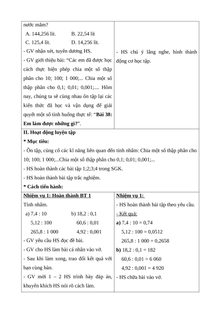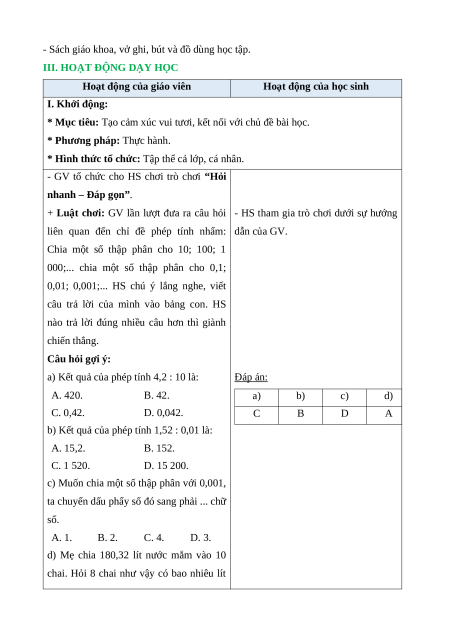 - Ôn tập, củng cố các kĩ năng liên quan đến tính nhẩm: Chia một số thập phân cho