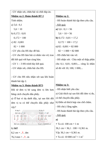 - HS hoàn thành bài tập theo yêu cầu. a) 5,6 : 0,1 - Kết quả: 5,6 × 10 a) 5,6 : 0,1 = 56 b) 0,172 : 0,01 5,6 × 10 = 56 0,172 × 100 b) 0,172 : 0,01 = 17,2 c) 82 : 0,001 0,172 × 100 = 17,2 82 × 1 000 c) 82 : 0,001 = 82 000