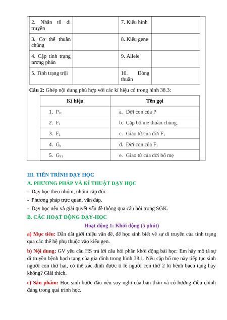 Câu 2: Ghép nội dung phù hợp với các kí hiệu có trong hình 38.3: Kí hiệu Tên gọi 1. Pt/c a. Đời con của P 2. F1