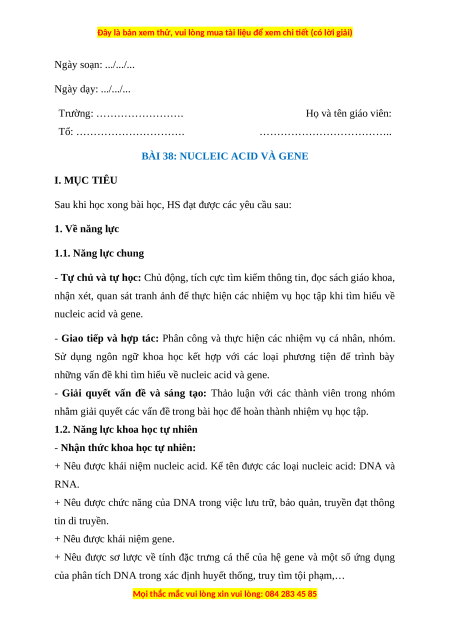 BÀI 38: NUCLEIC ACID VÀ GENE I. MỤC TIÊU