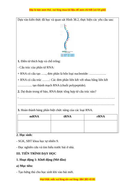 3. Hoàn thành bảng phân biệt chức năng của các loại RNA. mRNA tRNA rRNA 2. Học sinh:
