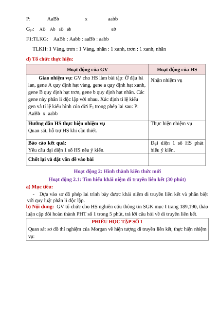 Hoạt động 2.1: Tìm hiểu khái niệm di truyền liên kết (30 phút) a) Mục tiêu: