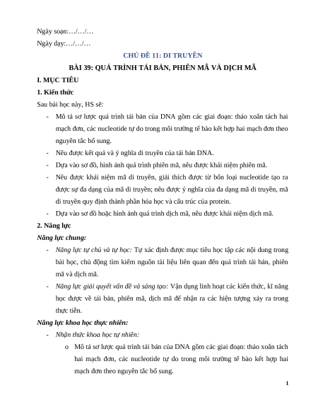 BÀI 39: QUÁ TRÌNH TÁI BẢN, PHIÊN MÃ VÀ DỊCH MÃ I. MỤC TIÊU 1. Kiến thức Sau bài học này, HS sẽ: