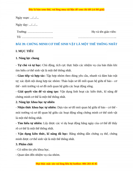BÀI 39: CHỨNG MINH CƠ THỂ SINH VẬT LÀ MỘT THỂ THỐNG NHẤT I. MỤC TIÊU 1. Năng lực chung