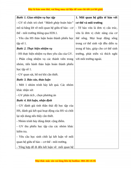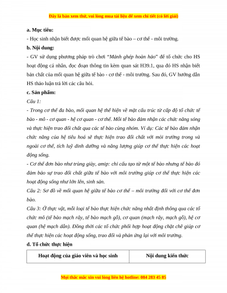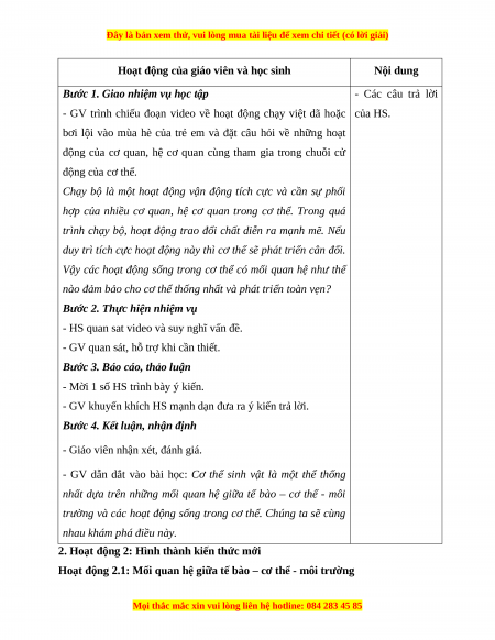 - Học sinh nhận biết được mối quan hệ giữa tế bào – cơ thể - môi trường. b. Nội dung: