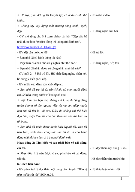 a. Mục tiêu: HS nêu được những cái đúng, cái tốt cần bảo vệ. b. Cách tiến hành