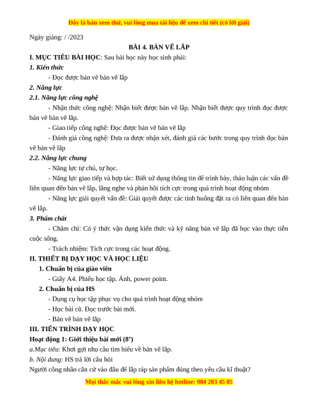 Giáo án Bài 4 Công nghệ 8 Cánh diều: Bản vẽ lắp