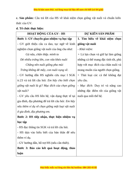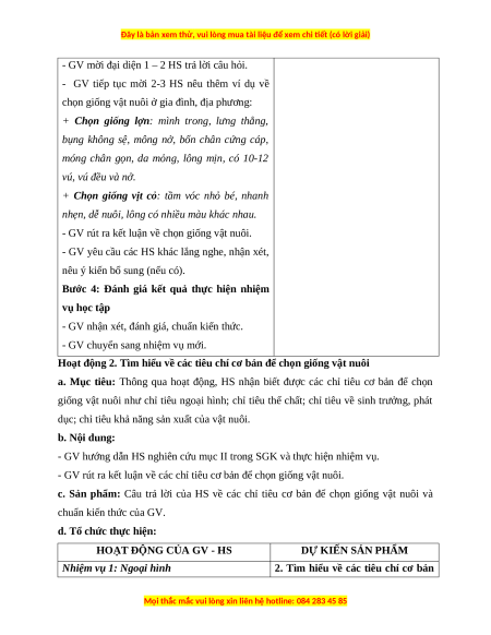 c. Sản phẩm: Câu trả lời của HS về chọn giống vật nuôi, các chỉ tiêu cơ bản để chọn