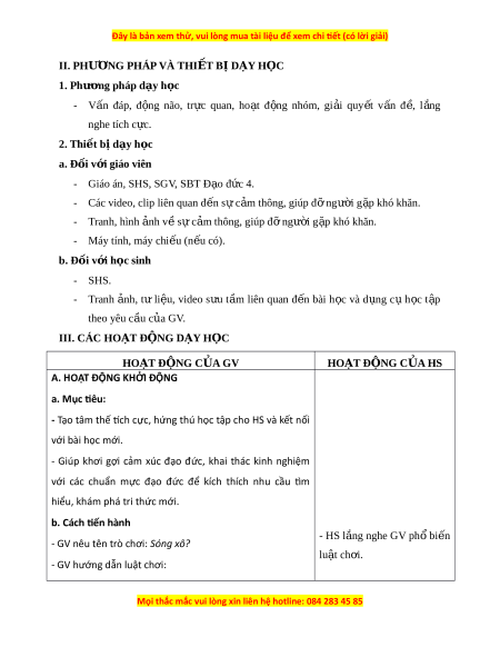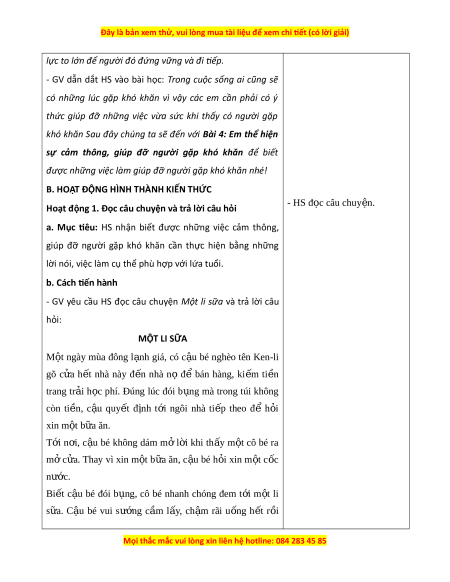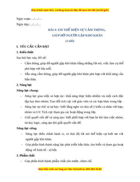 - Các video, clip liên quan đ n ế s ự c m ả thông, giúp đ ỡ ng i ườ g p ặ khó khăn. - Tranh, hình n ả h v ề s ự c m ả thông, giúp đ ỡ ng i ườ g p ặ khó khăn. - Máy tính, máy chi u ế (n u ế có). b. Đ i ố v i ớ h c ọ sinh - SHS. - Tranh n ả h, tư li u ệ , video s u ư t m ầ liên quan đ n ế bài h c ọ và d n ụ g c ụ h c ọ t p ậ theo yêu c u ầ c a ủ GV. III. CÁC HO T Ạ Đ N Ộ G D Y Ạ H C Ọ HO T Ạ ĐỘNG C A Ủ GV HOẠT ĐỘNG C A Ủ HS