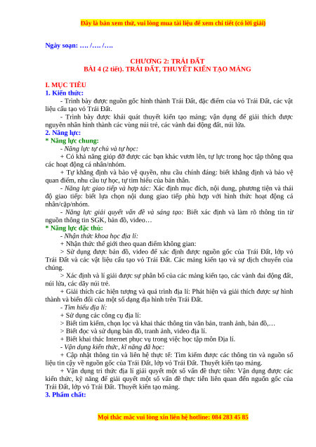 BÀI 4 (2 tiết). TRÁI ĐẤT, THUYẾT KIẾN TẠO MẢNG I. MỤC TIÊU 1. Kiến thức: