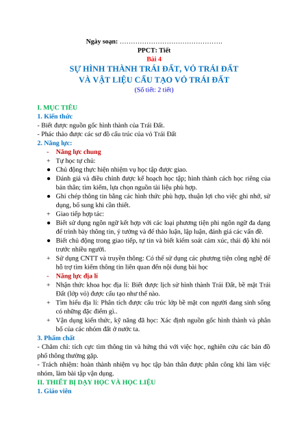 VÀ VẬT LIỆU CẤU TẠO VỎ TRÁI ĐẤT (Số tiết: 2 tiết) I. MỤC TIÊU 1. Kiến thức