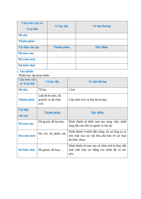 - Giáo án, sơ đồ về cấu trúc của vỏ Trái Đất. - Phiếu học tập.