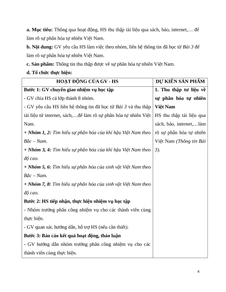 + Nhóm 5, 6: Tìm hiểu sự phân hóa của sinh vật Việt Nam theo Bắc – Nam.