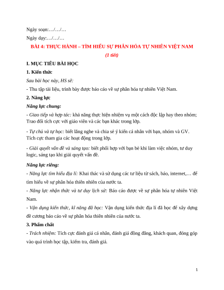 - Năng lực nhận thức và tư duy lịch sử: Báo cáo được về sự phân hóa tự nhiên Việt Nam.