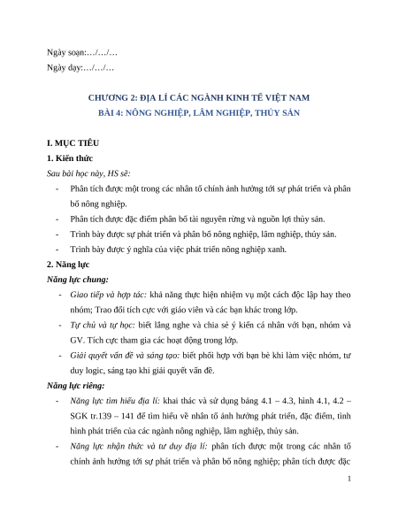 BÀI 4: NÔNG NGHIỆP, LÂM NGHIỆP, THỦY SẢN I. MỤC TIÊU 1. Kiến thức