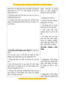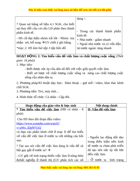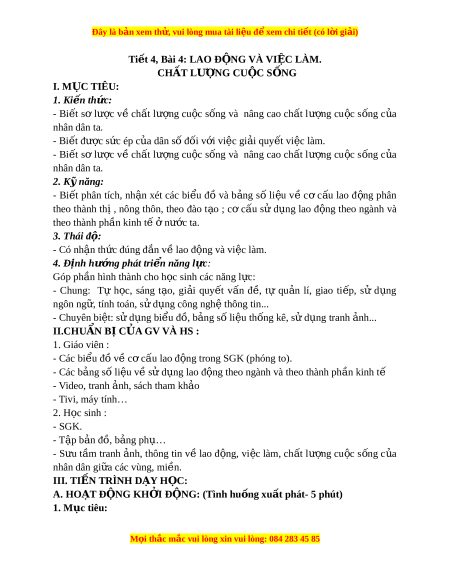 Đây là bản xem th , vu ử i lòng mua tài li u ệ đ xe ể m chi ti t (c ế ó l i ờ gi i ả ) Ti t ế 4, Bài 4: LAO Đ N Ộ G VÀ VI C Ệ LÀM. CHẤT LƯ N Ợ G CU C Ộ S N Ố G I. M C Ụ TIÊU: 1. Ki n ê th c: ư - Bi t ế sơ lư c ợ v ề ch t ấ lư ng ợ cu c ộ s ng ố và nâng cao ch t ấ lư ng ợ cu c ộ s ng ố c a ủ nhân dân ta. - Bi t ế đư c ợ s c ứ ép c a dân ủ s đ ố i ố v i ớ vi c gi ệ i ả quy t ế vi c l ệ àm. - Bi t ế sơ lư c ợ v ề ch t ấ lư ng ợ cu c ộ s ng ố và nâng cao ch t ấ lư ng ợ cu c ộ s ng ố c a ủ nhân dân ta. 2. K năng y : - Bi t ế phân tích, nh n ậ xét các bi u ể đồ và b ng ả s ố li u ệ v ề c ơ c u ấ lao đ ng ộ phân