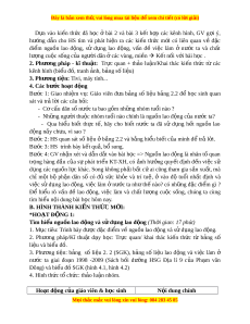 ệ Tivi, máy tính... 4. Các bư c ớ ho t ạ đ ng ộ Bư c ớ 1: Giao nhi m ệ v : ụ Giáo viên đ a ư b ng ả số li u ệ b ng ả 2.2 để h c ọ sinh quan sát và tr l ả i ờ các câu h i ỏ : - Cơ cấu dân s n ố ư c t ớ a bao g m ồ nh ng nhóm ữ tu i ổ nào ? - Nh ng ng ữ ư i ờ thu c ộ nhóm tu i ổ nào chính là ngu n l ồ ao đ ng ộ c a n ủ ư c ớ ta? - Qua hi u ể bi t ế th c ự t , ế hãy cho bi t ế nư c ớ ta đã sử d ng ụ h t ế ngu n ồ lao đ ng ộ n y ch ầ a, ư vì sao ? Bư c 2: ớ HS quan sát số li u ệ b ở ng 2.2 ả và b ng ằ hi u bi ể t ế c a ủ mình để tr l ả i ờ . Bư c 3: ớ HS trình bày k t ế qu , b ả s ổ ung. Bư c ớ 4: GV nh n ậ xét và d n ẫ d t ắ vào bài h c ọ => Ngu n ồ lao đ ng ộ là nhân t quan ố tr ng ọ hàng đ u ầ c a ủ sự phát tri n ể KT-XH, có nh ả hư ng ở quy t ế đ nh ị đ n ế vi c ệ sử d ng ụ các ngu n ồ l c ự khác. Song không ph i ả b t ấ c ứ ai cũng tham gia s n ả xu t ấ , mà chỉ m t ộ bộ ph n ậ dân số có đủ s c ứ kh e