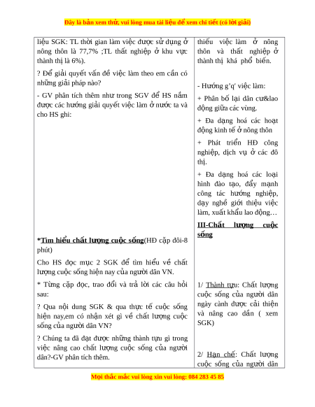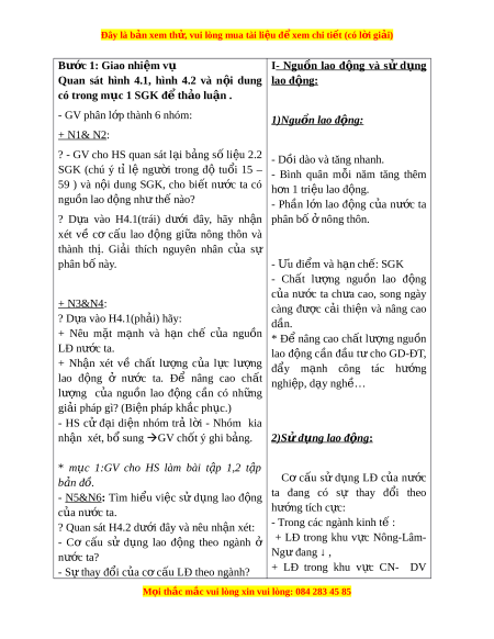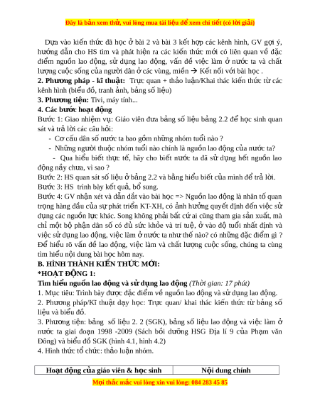 Đây là bản xem th , vu ử i lòng mua tài li u ệ đ xe ể m chi ti t (c ế ó l i ờ gi i ả ) D a ự vào ki n ế th c ứ đã h c ọ ở bài 2 và bài 3 k t ế h p ợ các kênh hình, GV g i ợ ý, hư ng ớ d n ẫ cho HS tìm và phát hi n ệ ra các ki n ế th c ứ m i ớ có liên quan về đ c ặ đi m ể nguồn lao đ ng, ộ sử d ng ụ lao đ ng, ộ v n ấ đề vi c ệ làm ở nư c ớ ta và ch t ấ lư ng ợ cu c s ộ ống c a ủ ngư i ờ dân ở các vùng, mi n ề K t ế nối v i ớ bài h c ọ . 2. Phư ng ơ pháp - kĩ thu t ậ : Tr c ự quan + th o ả lu n/ ậ Khai thác ki n ế th c ứ từ các kênh hình (bi u đ ể ồ, tranh nh, ả b ng s ả l ố i u) ệ 3. Phư ng ơ ti n: