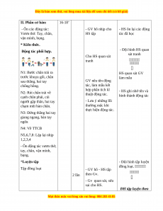 Động tác phối hợp. - Đội hình HS quan sát tranh Cho HS quan sát tranh N1: Bước chân trái ra HS quan sát GV trước khuỵu gối, chân làm mẫu sau thẳng, hai tay GV nêu tên động chống hông. tác, làm mẫu kết hợp phân tích kĩ N2: Rút chân trái về - HS ghi nhớ tên và thuật động tác. cạnh chân phải, cúi hình thành động tác người gập thân, hai tay - Lưu ý những lỗi chạm mũi bàn chân. thường mắc khi thực hiện động tác. N3: Đứng thằng hai tay giang ngang, bàn tay ngửa N4: Về TTCB N5,6,7,8: Lặp lại nhịp 1,2,3,4