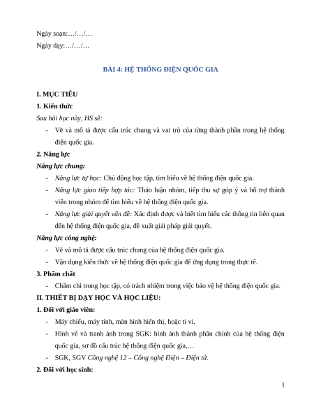 - Vận dụng kiến thức về hệ thống điện quốc gia để ứng dụng trong thực tế. 3. Phẩm chất
