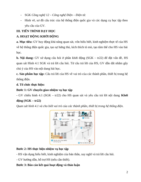 - Vẽ và mô tả được cấu trúc chung và vai trò của từng thành phần trong hệ thống điện quốc gia. 2. Năng lực