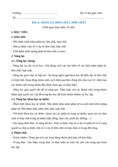 - Năng lực tự chủ và tự học: Chủ động, tích cực tìm hiểu về các khái niệm phân tử, đơn chất, hợp chất.