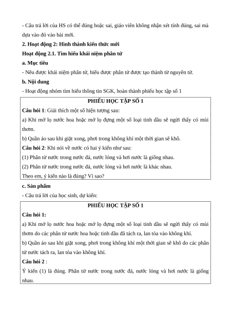 Hoạt động 2.1. Tìm hiểu khái niệm phân tử a. Mục tiêu