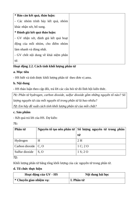 - Nhận thức khoa học tự nhiên: Nêu được khái niệm phân tử và cách tính khối lượng