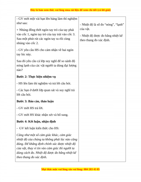 1. Giáo viên: nhiệt kế, các cốc nước, vật để đo nhiệt, bông và cồn y tế, giáo án,