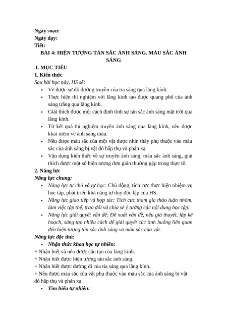 BÀI 4: HIỆN TƯỢNG TÁN SẮC ÁNH SÁNG. MÀU SẮC ÁNH SÁNG I. MỤC TIÊU 1. Kiến thức