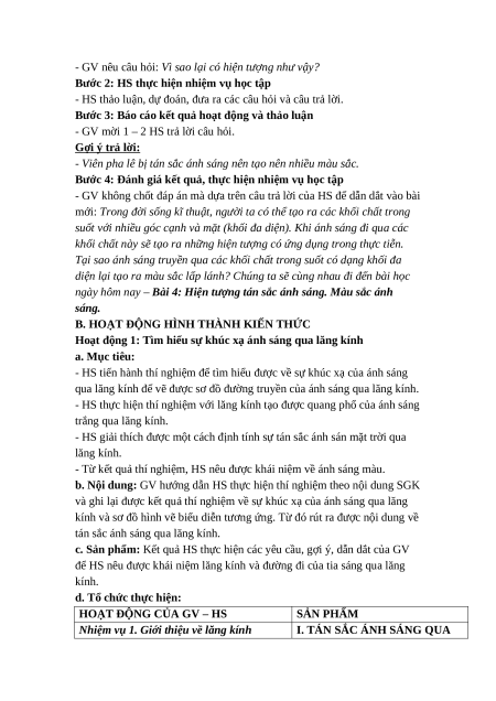 Hoạt động 1: Tìm hiểu sự khúc xạ ánh sáng qua lăng kính a. Mục tiêu:
