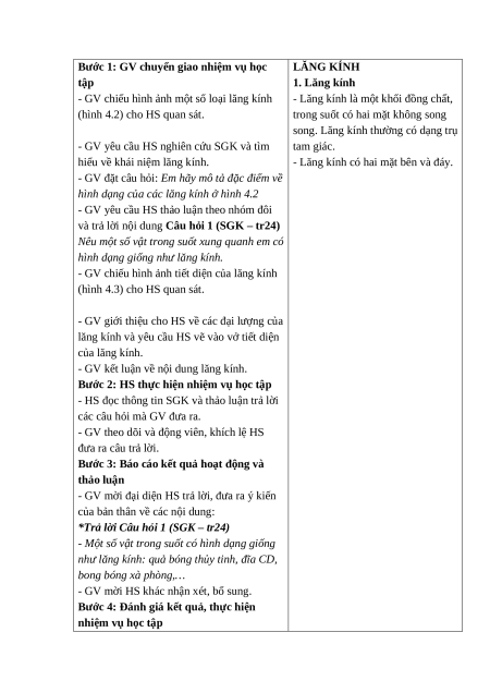 Bước 1: GV chuyển giao nhiệm vụ học LĂNG KÍNH tập 1. Lăng kính